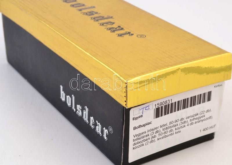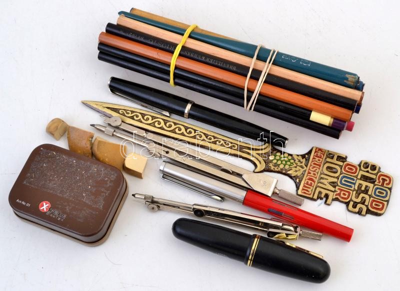 Beschreibung: Vegyes írószer tétel, 80-90 db: ceruzák (22 db), tollszárak (3 db), töltőtollak (3db), tolhegyek dobozban (kb. 50-60 db, köztük 4 db aranyozott), körzők (2 db), levélbontó kés