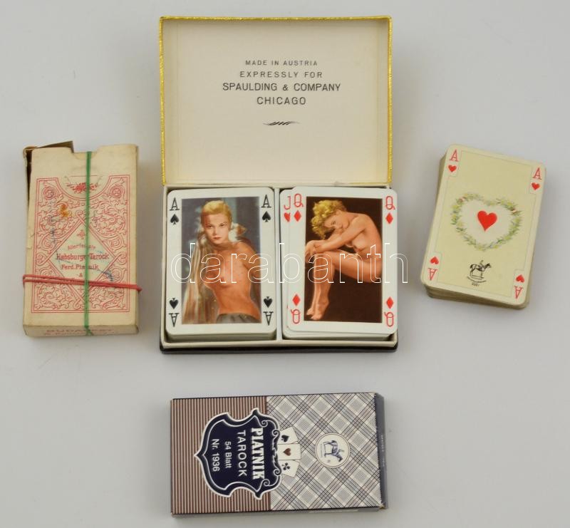 Vegyes kártya tétel, 5 pakli: Piatnik Allerfeinste Habsburger Tarock, 54 lapos pakli, 1 hiánnyal, színes litho, kopott adóbélyeggel, eredeti kissé viseltes dobozában.; Piatnik osztrák népviseletes tarokk kártya, 55 lapos.; Piatnik tarokk, 54 lapos, eredeti dobozában.; Erotikus tarokk kártya, 2 pakli, 55 laposak, Piatnik Vienna dobozban.