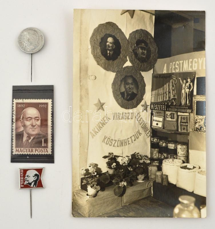 Beschreibung: cca 1950 Rákosi Mátyás emléktabló fotója, hozzá bélyeg és Sztálint és Lenint ábrázoló érme és jelvény