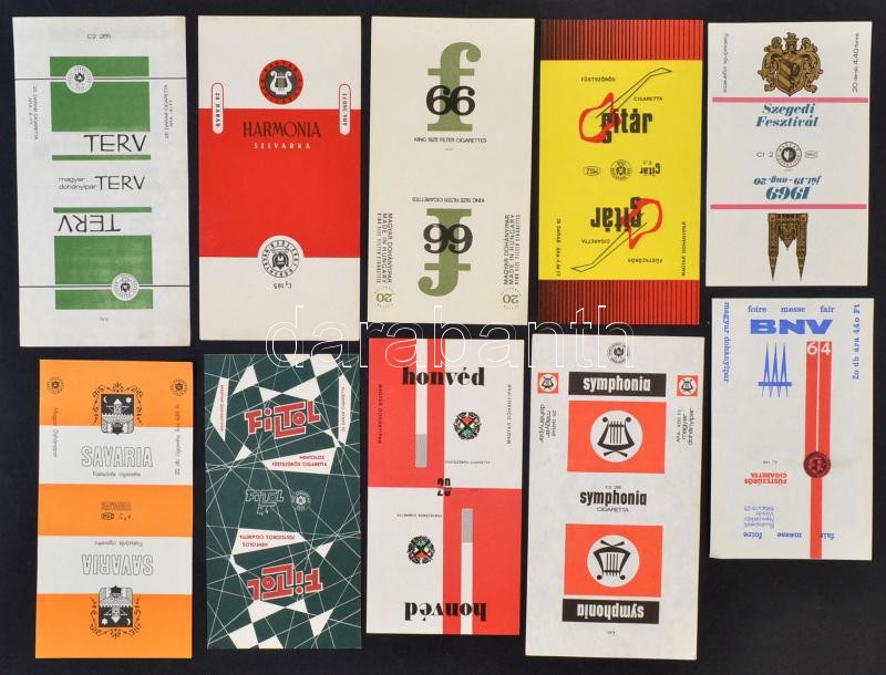 cca 1960-1970 10 db még hajtatlan cigarettásdoboz (BNV, Szegedi Fesztivál, Savaria, Terv, Symphonia, F66, Gitár, Filtol, Harmonia szívarka, Honvéd), 19x10 cm és 9,5x15,5 cm közötti méretben.