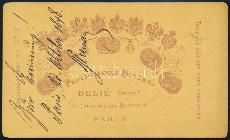 Beschreibung: 1878 Disderi párizsi műtermében készült, Herman feliratú, vizitkártya méretű fénykép, 10x6,5 cm