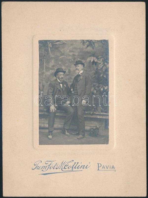 1906 Milánó, Id. Mátrai Lajos (1850-1906) szobrász és Nádler Róbert (1858-1938) festőművész a milánói világkiállításon, kartonra kasírozott fotó M.Collini műterméből, 10x7 cm