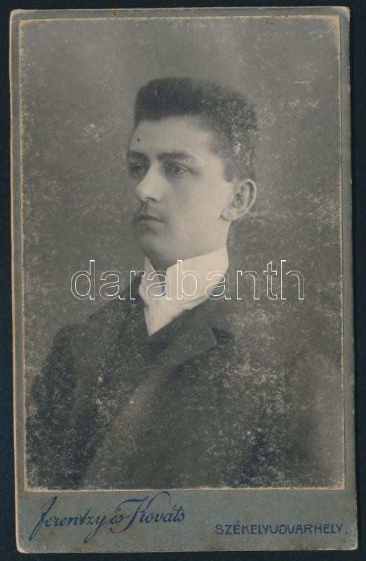 Beschreibung: 1908 Dr. Kiss Ferenc (1875-1941) anatómia professzor érettségi fotója, hátoldalon feliratozott keményhátú fotó, 10x6,5 cm