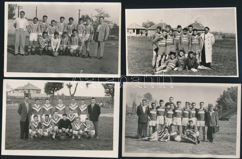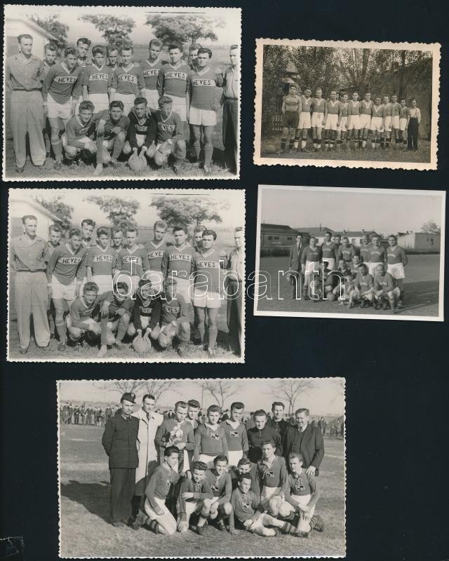 Beschreibung: 1956-1961 Heves megyei foci válogatott, illetve megyei futball csoportok, 9 db hátoldalt részben feliratozott fotó, 6x9 és 9x14 cm közötti méretekben