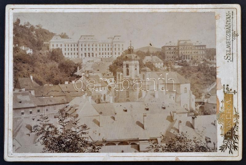 cca 1890 Selmecbánya, Látkép, M. Kir. Bányászati és Erdészeti Akadémia palota, templom, Baker Alajos műterméből, kartonra kasírozva, 11x16 cm / cca 1890 Banská Štiavnica (Schmenitz) mining and forestry college palaces, church, 11x16 cm