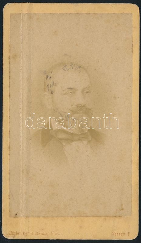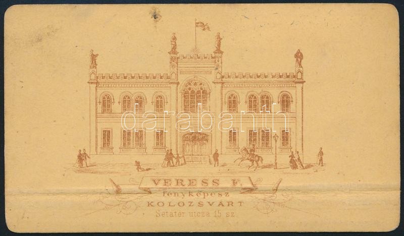 cca 1900 Kolozsvár, Férfiportré, keményhátú fotó Veress Ferenc (1832-1916) neves kolozsvári fényképész műterméből, hátoldalon a műterem képével, foltos, 10,5x6 cm