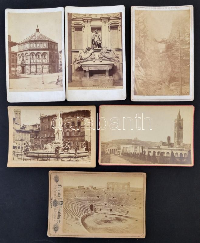 cca 1900 Olasz és svájci városképes keményhátú fotók, többek közt Firenze, Verona, összesen 6 db, 17x11 cm / cca 1900 Italian and Swiss town-view photos, 6 pcs, 17x11 cm