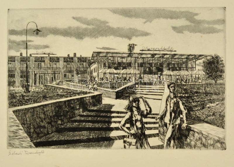 Beschreibung: Jelzés nélkül: Szelidi Tóvendéglő. Rézkarc, papír, 19×29 cm
