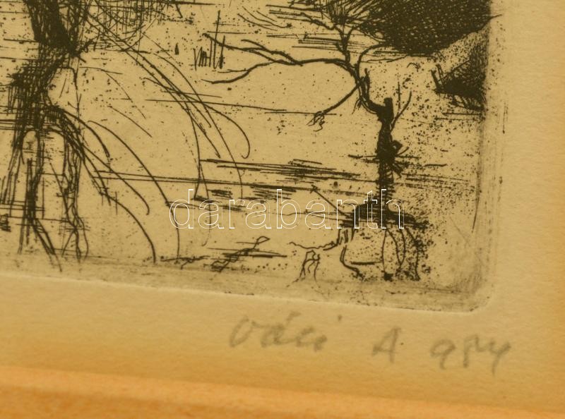 Beschreibung: Váci András (1928-1989): Várpalota, rézkarc, papír, jelzett, paszpartuban, üvegezett fa keretben, 14×10 cm