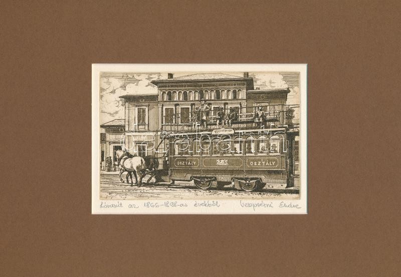 Beschreibung: Veszprémi Endre (1925- ): Lóvasút az újpesti végállomásnál, rézkarc, papír, jelzett, paszpartuban, 9,5×15 cm