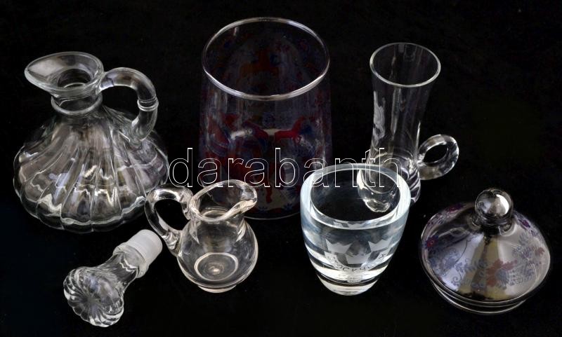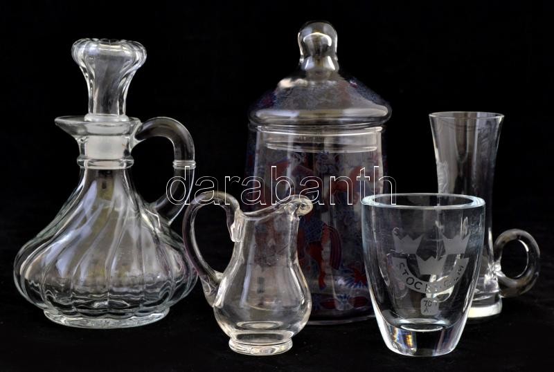 Vegyes üveg tétel, 5 db: Vadászjelenetes bonbonier, fújt, 15 cm.; Stockholm feliratú üvegpohár, m: 7 cm.; Kis üvegkiöntő dugóval, formába öntött, m: 13 cm.; Kis kiöntő, m: 7 cm.; Pálinkás üvegpohár, virágmintával, m: 10 cm.