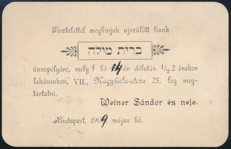 Beschreibung: 1909 Budapest, körülmetélési (brit milá) meghívókártya /