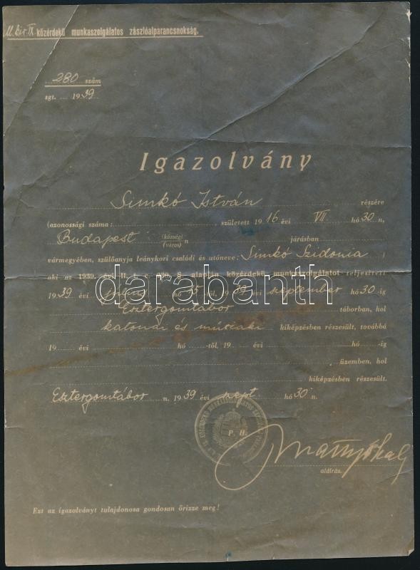 1939 Esztergomtábor, A M. kir. IX. közérdekű munkaszolgálatos zászlópa... https://www.darabanth.com/de/297-Fernauktion/297.0/Andere-Sammelgebiete/Judaica~200025/1939-Esztergomtabor-A-M-kir-IX-kozerdeku-munkaszolgalatos-zaszloparancsnoksag-altal-kiC3~II1586673