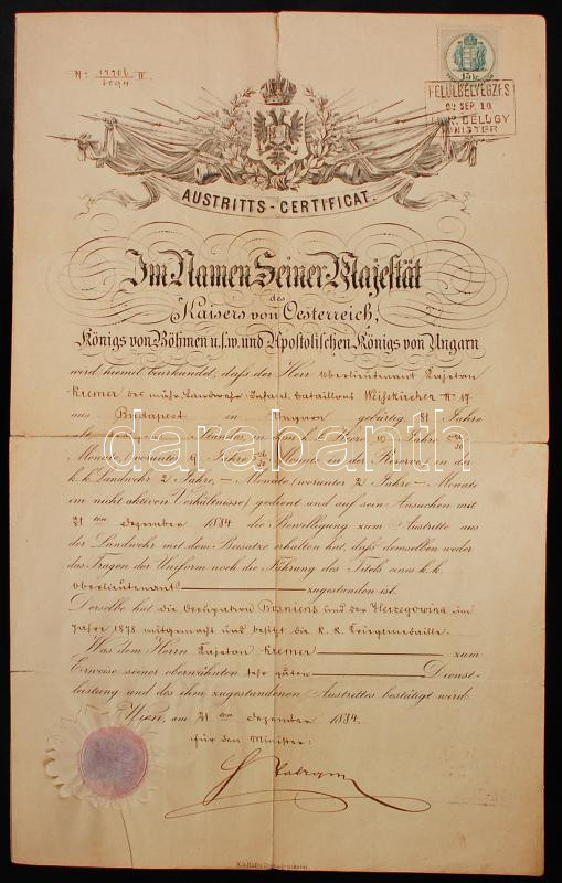 1884 Bécs, Katonai szolgálatból való hivatalos elbocsátást igazoló okm... https://www.darabanth.com/de/297-Fernauktion/297.0/Andere-Sammelgebiete/Militaria~200027/1884-Becs-Katonai-szolgalatbol-valo-hivatalos-elbocsatast-igazolo-okmany-nemet-nyelven-szC3~II943440