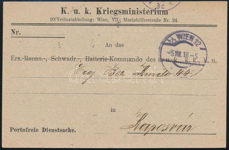 1918 Bécsi hadügyminisztériumi értesítő elesett katonáról https://www.darabanth.com/de/297-Fernauktion/297.0/Andere-Sammelgebiete/Militaria~200027/1918-Becsi-hadugyminiszteriumi-ertesito-elesett-katonarol~II1574852
