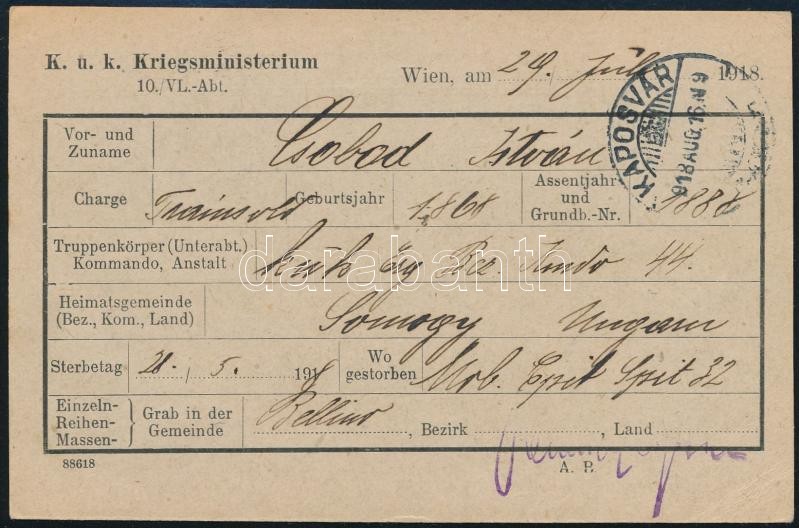 Beschreibung: 1918 Bécsi hadügyminisztériumi értesítő elesett katonáról