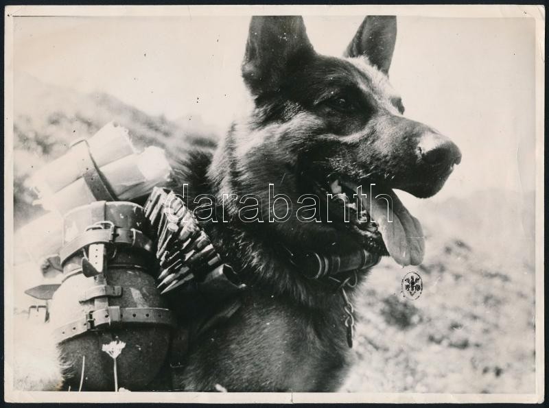 1943 Besorozott kutya a német hadseregben. Szállítási feladatokra használták őket. Hadi fotó, hátoldalán felirattal / Drafted dog for the Wehrmacht. German military dog on the field. Military propaganda photo with text 24x18 cm