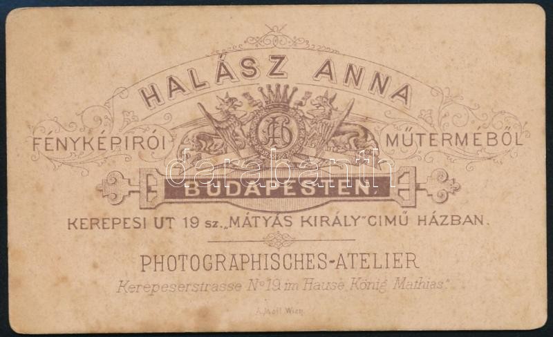 Beschreibung: cca 1885 Huszártiszt műtermi portréja, keményhátú fotó Halász Anna budapesti műterméből, 11x6,5 cm