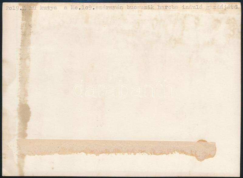 cca 1940-1945 Kutya búcsúzik az Me.109-es vadászrepülő szárnyán harcba... https://www.darabanth.com/de/297-Fernauktion/297.0/Andere-Sammelgebiete/Militaria~200027/cca-1940-1945-Kutya-bucsuzik-az-Me109-es-vadaszrepulo-szarnyan-harcba-indulo-gazdajatol-~II1587403
