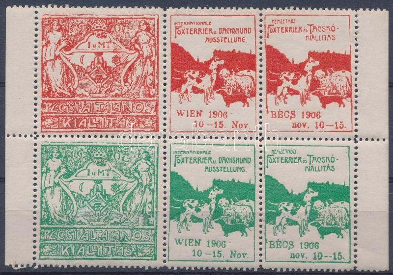 Beschreibung: 1906 Pécsi általános és bécsi kutyakiállítás levélzáró ívszéli 6-os tömb