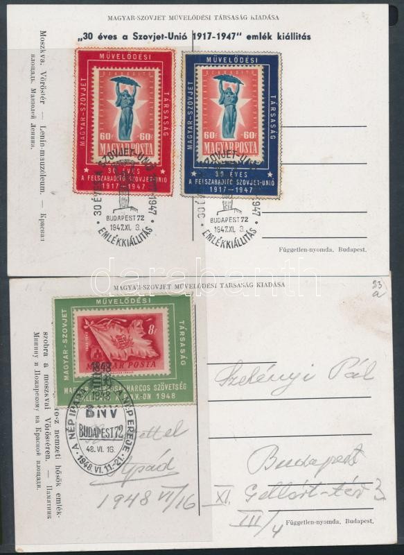 Beschreibung: 1948 Magyar-szovjet Művelődési Társaság 3 klf levélzáró 2 db képeslapon alkalmi bélyegzésekkel