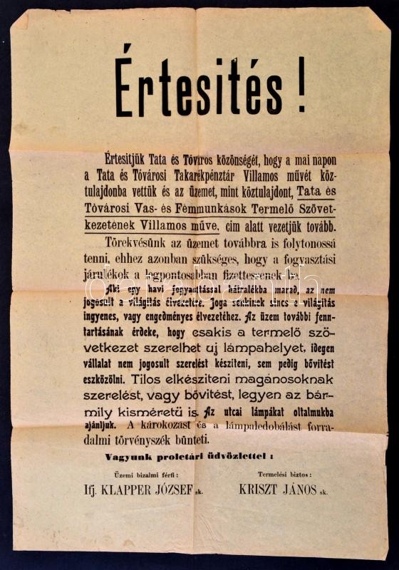 1919 Értesítés Tata és Tóvárosi Takarékpénztár Villamos Művének köztul... https://www.darabanth.com/de/297-Fernauktion/297.0/Andere-Sammelgebiete/Poster~200030/1919-Ertesites-Tata-es-Tovarosi-Takarekpenztar-Villamos-Muvenek-koztulajdonba-vetelerC5~II1586067