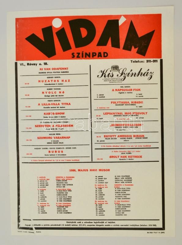 1986 Vidám Színpad május havi műsorának plakátja, hajtott, 41,5x30,5 c... https://www.darabanth.com/de/297-Fernauktion/297.0/Andere-Sammelgebiete/Poster~200030/1986-Vidam-Szinpad-majus-havi-musoranak-plakatja-hajtott-41-5x30-5-cm~II1554808