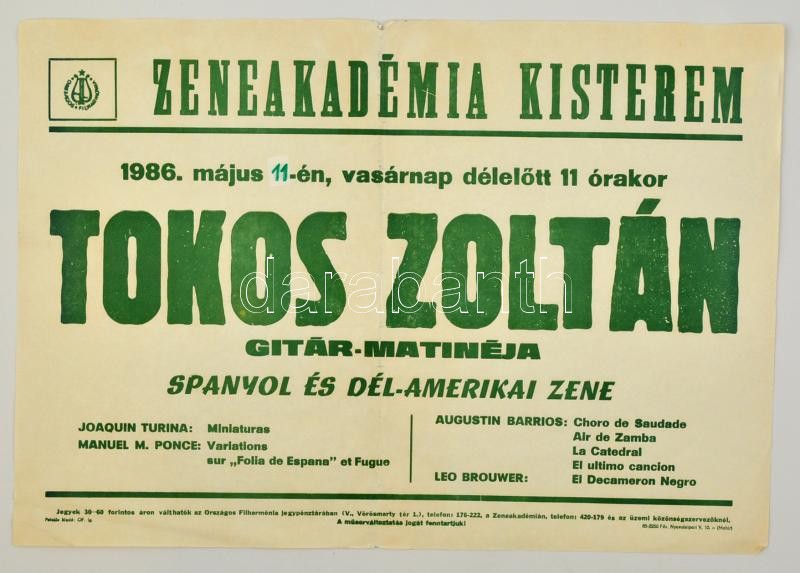 1986 Zeneakadémia, Tokos Zoltán gitár-matinéjának plakátja, hajtott, h... https://www.darabanth.com/de/297-Fernauktion/297.0/Andere-Sammelgebiete/Poster~200030/1986-Zeneakademia-Tokos-Zoltan-gitar-matinejanak-plakatja-hajtott-hajtasnal-kis-szakadas~II1554616