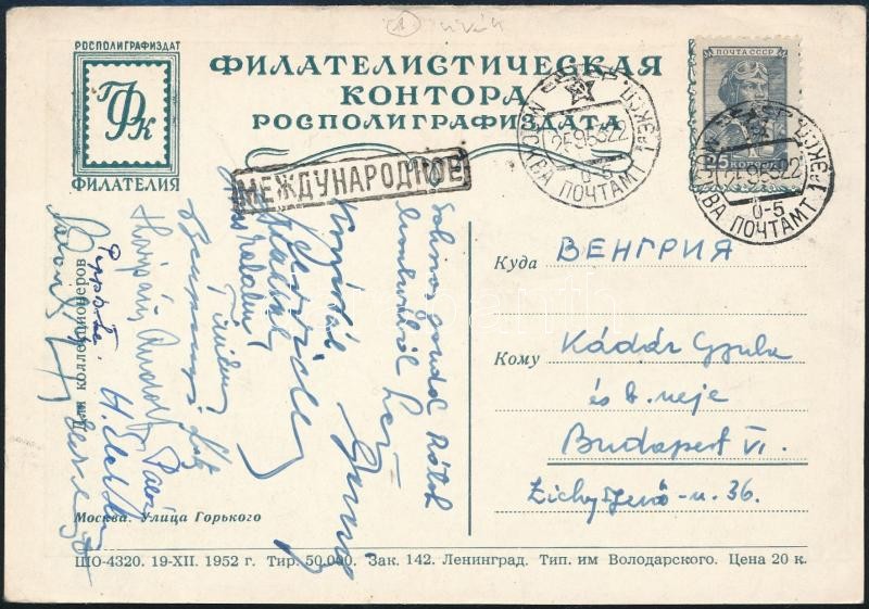 1953 A magyar vívó válogatott tagjainak aláírása képeslapon Moszkvából. Gerevich Aladár, Kovács Pál, Kárpáti Rudolf, Papp Bertalan, Elek Ilona, Elek Margit, Tilli Endre, Palocz Endre, Rerrich Béla / 1953 Autograph signed postcard of the Hungarian fencing team.