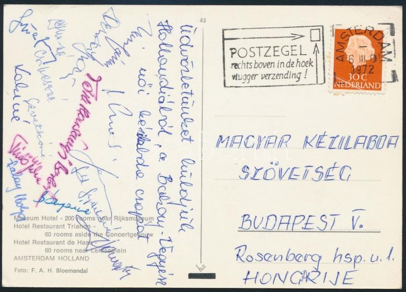 Beschreibung: 1972 A Bakony-Vegyész női kézilabda csapatának hazaküldött képeslapja aláírásokkal