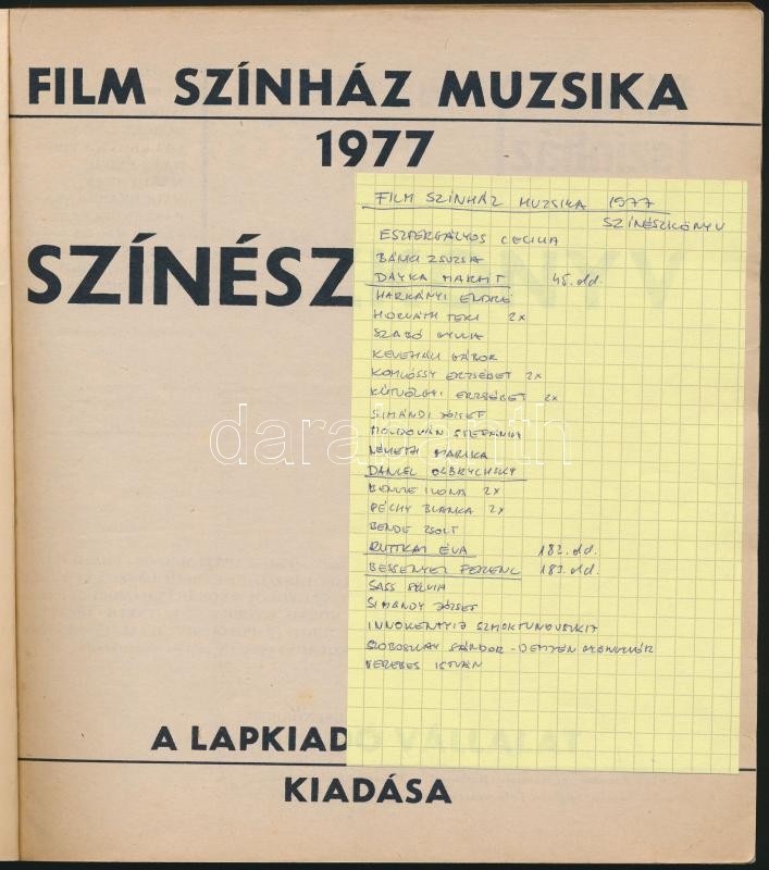 1977 A Film Színház Muzsika Szénész Könyve aláírásokkal (Ruttkai Éva, ... https://www.darabanth.com/de/297-Fernauktion/297.0/Andere-Sammelgebiete/Signatur~200021/1977-A-Film-Szinhaz-Muzsika-Szenesz-Konyve-alairasokkal-Ruttkai-Eva-Bessenyei-Ferenc-Day~II1587338
