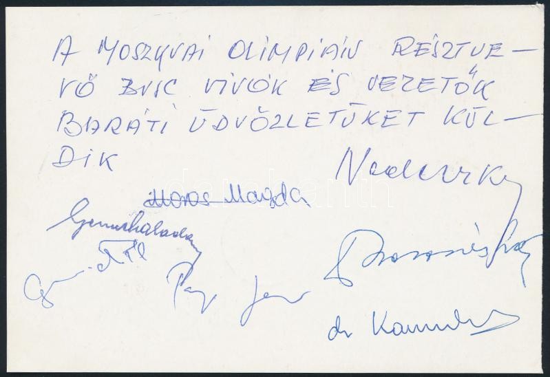 Beschreibung: A moszkvai olimpián résztvevő BVSC vívók és vezetők aláírásai üdvözlőlapon