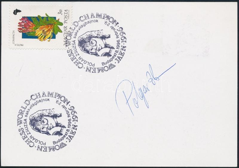 Beschreibung: Polgár Zsuzsa aláírása őt magát ábrázoló fotó hátulján, bélyegzésekkel