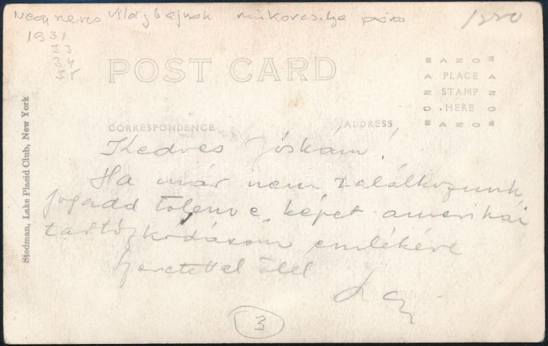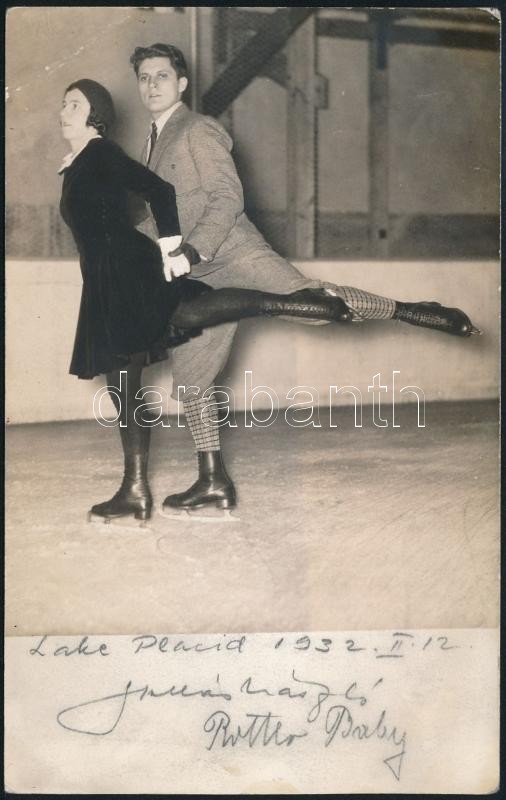 cca 1920 Magyar korcsolya négyszeres világbajnok Rotter Emília, Szollás László saját kézzel írt fotólapja / Autograph signed postcard of the Hungarian ice-skating world champions