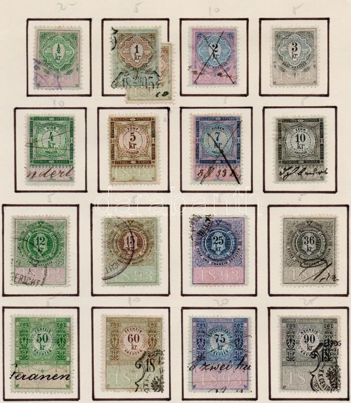 1893 osztrák okmánybélyeg sor, 1 érték hiányzik, 2 lapon https://www.darabanth.com/de/297-Fernauktion/297.0/Andere-Sammelgebiete/Stempelmarken~200018/1893-osztrak-okmanybelyeg-sor-1-ertek-hianyzik-2-lapon~II1584449