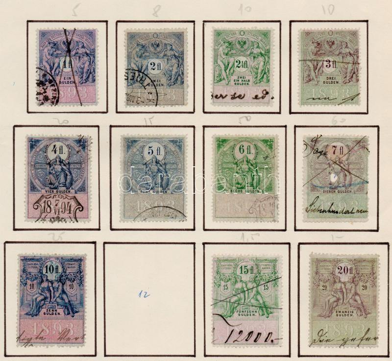 Beschreibung: 1893 osztrák okmánybélyeg sor, 1 érték hiányzik, 2 lapon