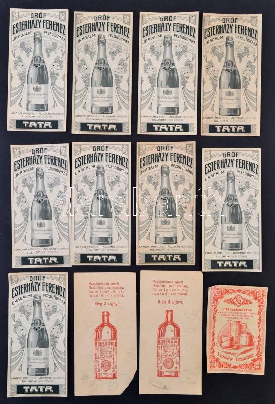 11 db számolócédula valamint 1 db nyomtatvány: Gróf Esterházy Ferenc Uradalmi Pezsgőgyára 9 db, Tata, Igmándi Keserűvíz 2 db, 1 db csészeszelvény, az egyik sérült.