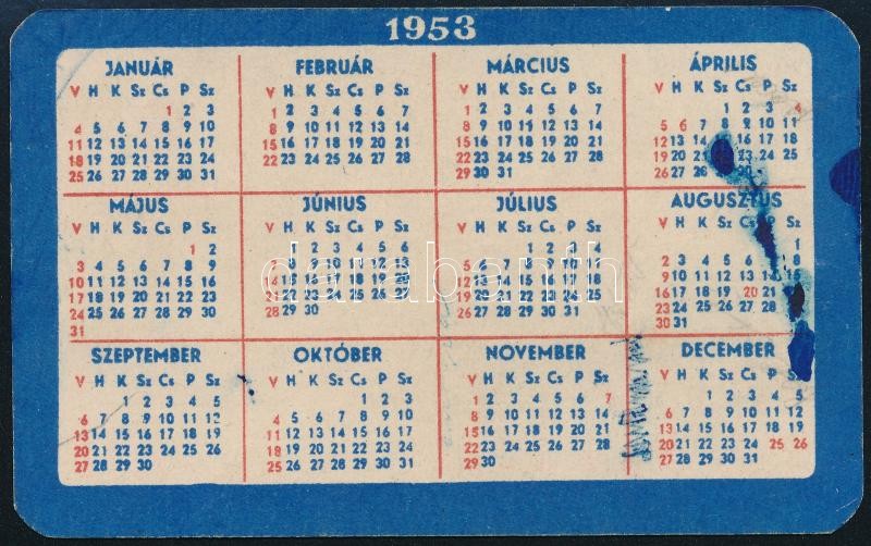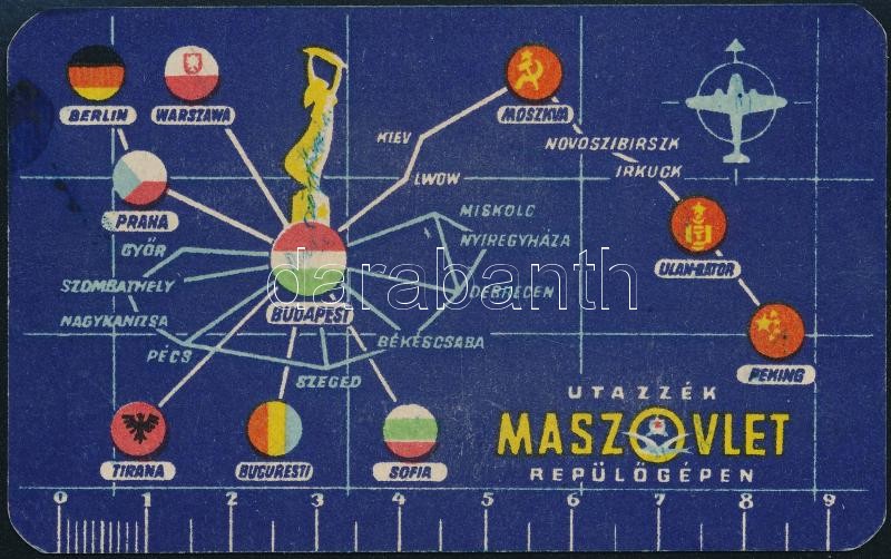 1953 "Utazzék MASZOVLET repülőgépen" - kártyanaptár, tintafoltokkal https://www.darabanth.com/de/297-Fernauktion/297.0/Andere-Sammelgebiete/Werbungen~200023/1953-Utazzek-MASZOVLET-repulogepen--kartyanaptar-tintafoltokkal~II1586260