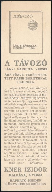 Beschreibung: Kner Izidor reklám könyvjelző, Lányi Sarolta verseskötetének (A távozó, 1914) reklámjával