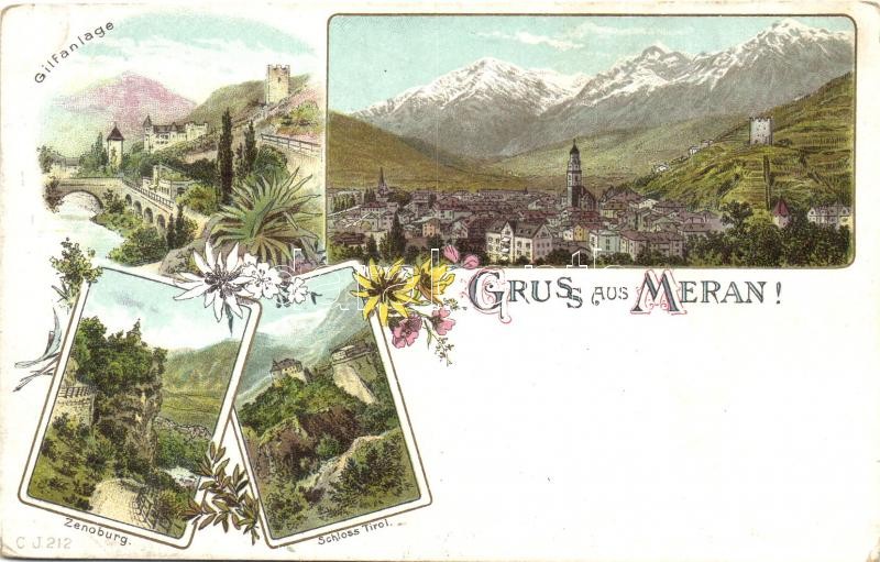 Beschreibung: Meran, Merano (Südtirol); Gilfanlage, Zenoburg, Schloss Tirol / general view, castle, floral Art Nouveau litho (EK)