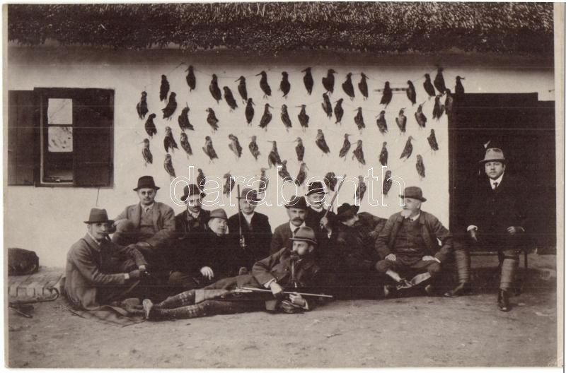 Beschreibung: 1912 Zombor, Sombor; vadászok csoportképe falra tűzött lelőtt madarakkal a Vajdaságban / hunters group photo with hunted birds. photo