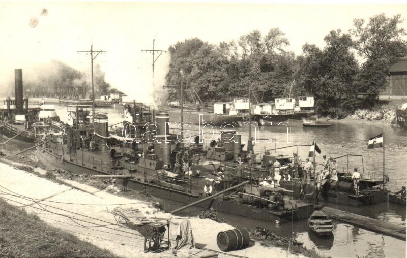 Beschreibung: 1926 "Badacsony", "Szeged" és "Kecskemét" őrnaszádok legénységgel a fedélzeten az óbudai kikötőben, Emke fotószalon. Dunai Flottila / Donau-Flotille / Hungarian river guard ships, photo