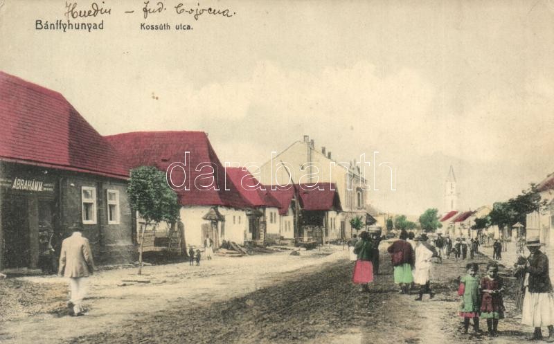 Beschreibung: Bánffyhunyad, Huedin; Kossuth utca, Ábrahám M. üzlete és saját kiadása / street, shop