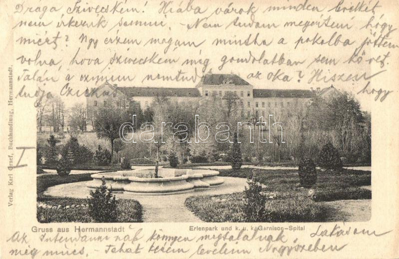 Nagyszeben, Hermannstadt, Sibiu; Erlenpark, K. u. K. Garnisonspital / ... https://www.darabanth.com/de/297-Fernauktion/297.0/Ansichtskarten/Siebenburgen~8/Nagyszeben-Hermannstadt-Sibiu-Erlenpark-K-u-K-Garnisonspital-park-katonai-korhaz-kiadja~II1465238
