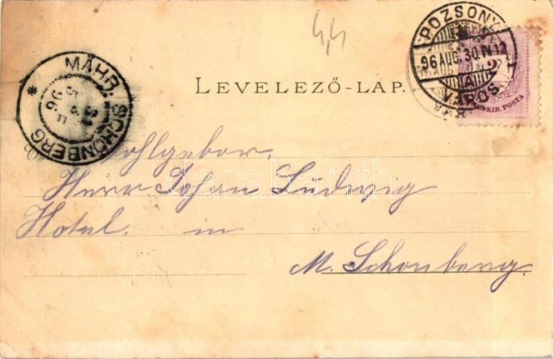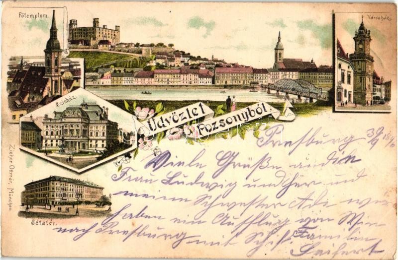 1896 (Vorläufer!!) Pozsony, Pressburg, Bratislava; Fő templom, látkép, színház, sétatér, városháza, híd / general view, church, theater, promenade, city hall, bridge, Ottmar Zieher floral Art Nouveau litho (EK)