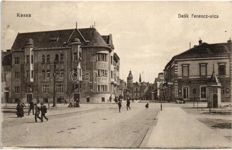 Kassa, Kosice; Deák Ferenc utca, gyógyszertár / square, pharmacy https://www.darabanth.com/de/297-Fernauktion/297.0/Ansichtskarten/Slowakei~9/Kassa-Kosice-Deak-Ferenc-utca-gyogyszertar-square-pharmacy~II1590551