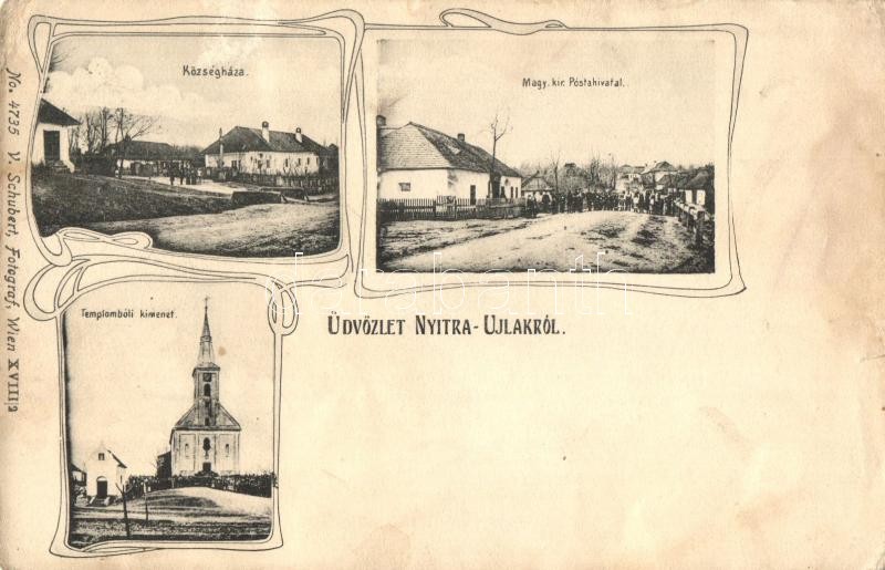 Nyitraújlak, Velké Záluzie; Községháza, M. kir. postahivatal, templom, utcakép, V. Schubert kiadása / town hall, post office, church, street view, Art Nouveau (ázott / wet damage)
