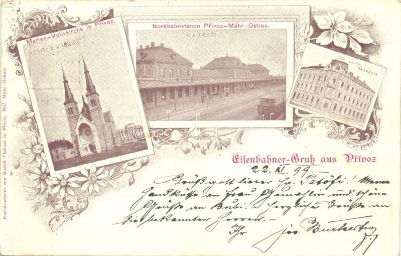 Beschreibung: 1899 Ostrava-Privoz, Mährisch Ostrau; Kostel, Nadrazi, Hotel Moravia / Marien-Votivkirche, Nordbahnstation, Verlag Rudolf Vichnar / church, railway station, hotel, floral Art Nouveau (EK)