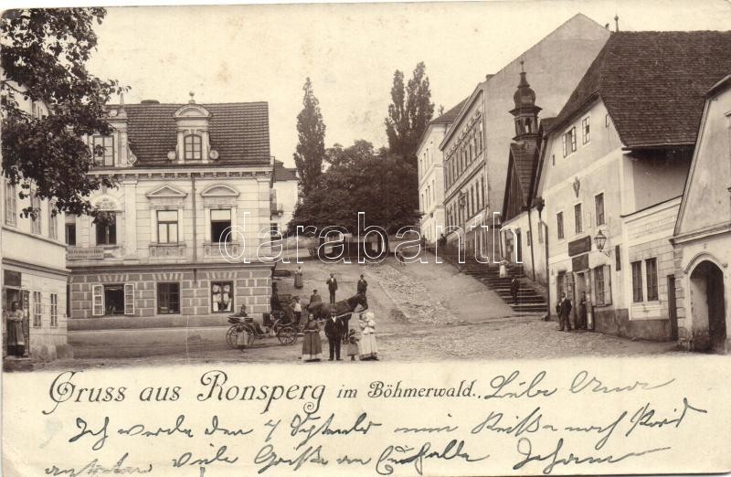 Beschreibung: 1900 Pobezovice, Ronsperg im Böhmerwald; K.k. Gendarmerie Posten / street view with k.u.k. gendarmerie, photo (EK)