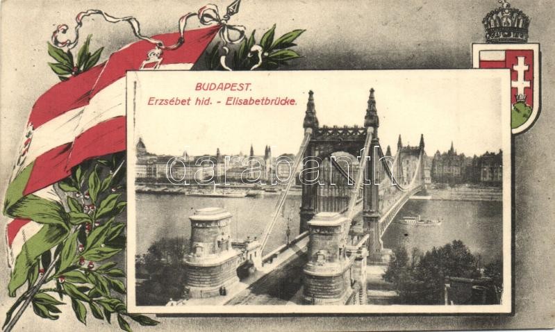 Budapest, Erzsébet híd, Magyar zászlós és címeres keret https://www.darabanth.com/de/297-Fernauktion/297.0/Ansichtskarten/Ungarn~7/Budapest-Erzsebet-hid-Magyar-zaszlos-es-cimeres-keret~II1589200